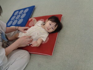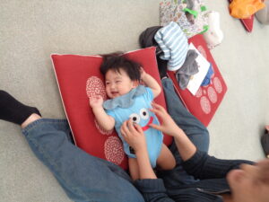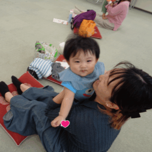 「いっぽんばしこちょこちょ」や「とんとんとんとんアンパンマン」などを行い、ごろんと横になってみたりママと向き合ってギューッとしたりして遊びました。ニコニコご機嫌です😊