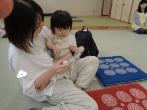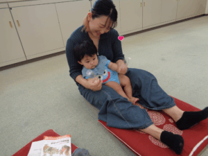 次に母子保健推進員さん達から絵本の読み聞かせをしていただきました。真剣に聞いている赤ちゃんもいました。