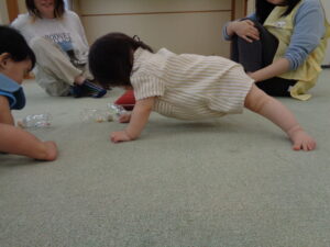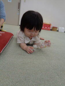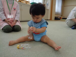 最後は先生からおもちゃのプレゼントをもらい「おもちゃのチャチャチャ」に合わせてフリフリしました♪お歌が終わったあともおもちゃで遊んでいました😊