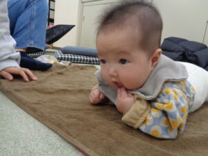 今日参加の赤ちゃんたちは、3~4か月が多く、バッチリ顔を上げて、腹ばいできていますね!