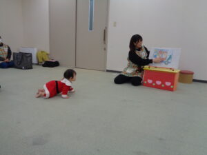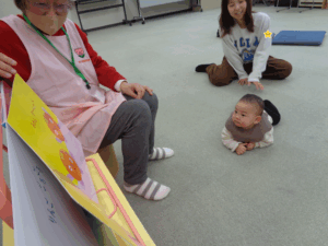 次に母子保健推進員さん達から絵本の読み聞かせをしていただきました。絵本に近づき自分でも見て触って、確かめていました。
