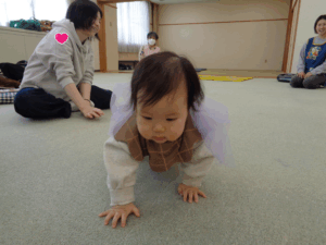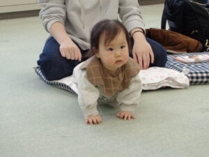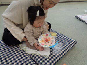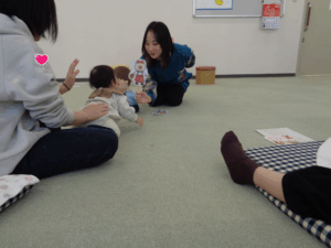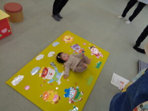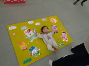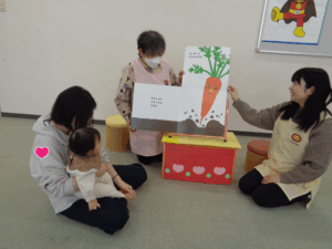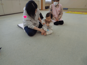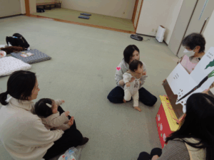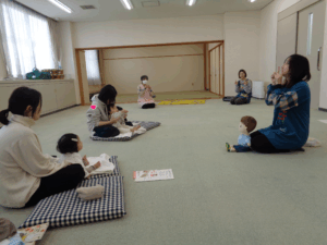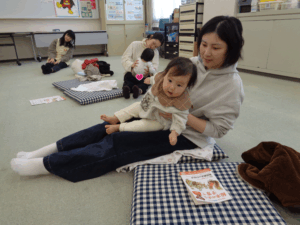 次に母子保健推進員さんから絵本の読み聞かせをしていただきました。近くに寄って見たり、静かに見たりしていました。