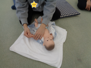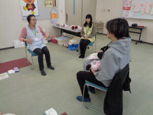 次に、抱っこやおむつ交換、沐浴など、お世話の仕方を人形を使って練習しました。