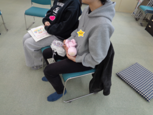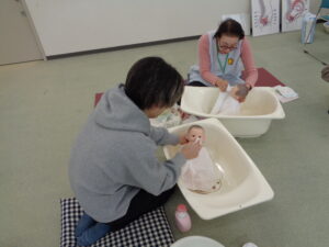 次に、抱っこやおむつ交換、沐浴など、お世話の仕方を人形を使って練習しました。