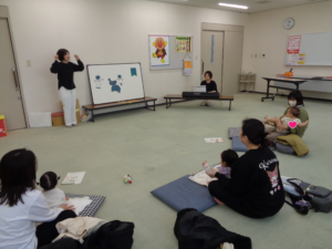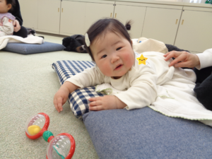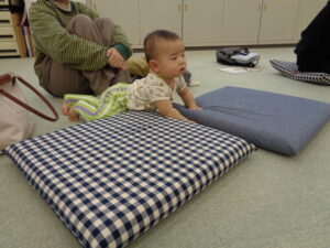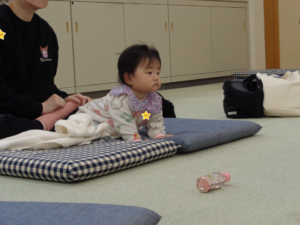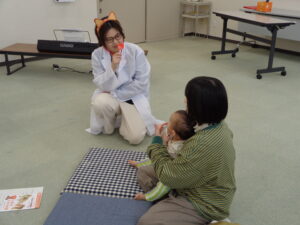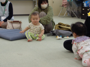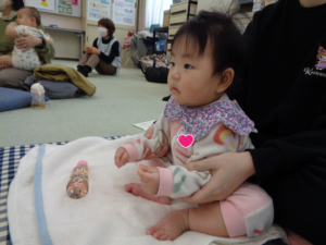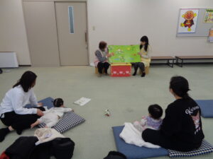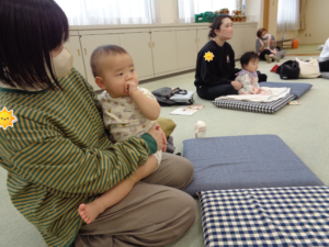 次に母子保健推進員さんから絵本の読み聞かせをしていただきました。じーっと見たり、リラックスしながら見たりしていました。