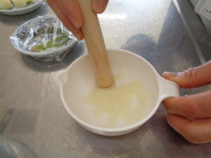 調理実習ではすり鉢を使ったすりつぶし方、葉物野菜の刻み方、お鍋での白身魚の加熱方法などを学びました。